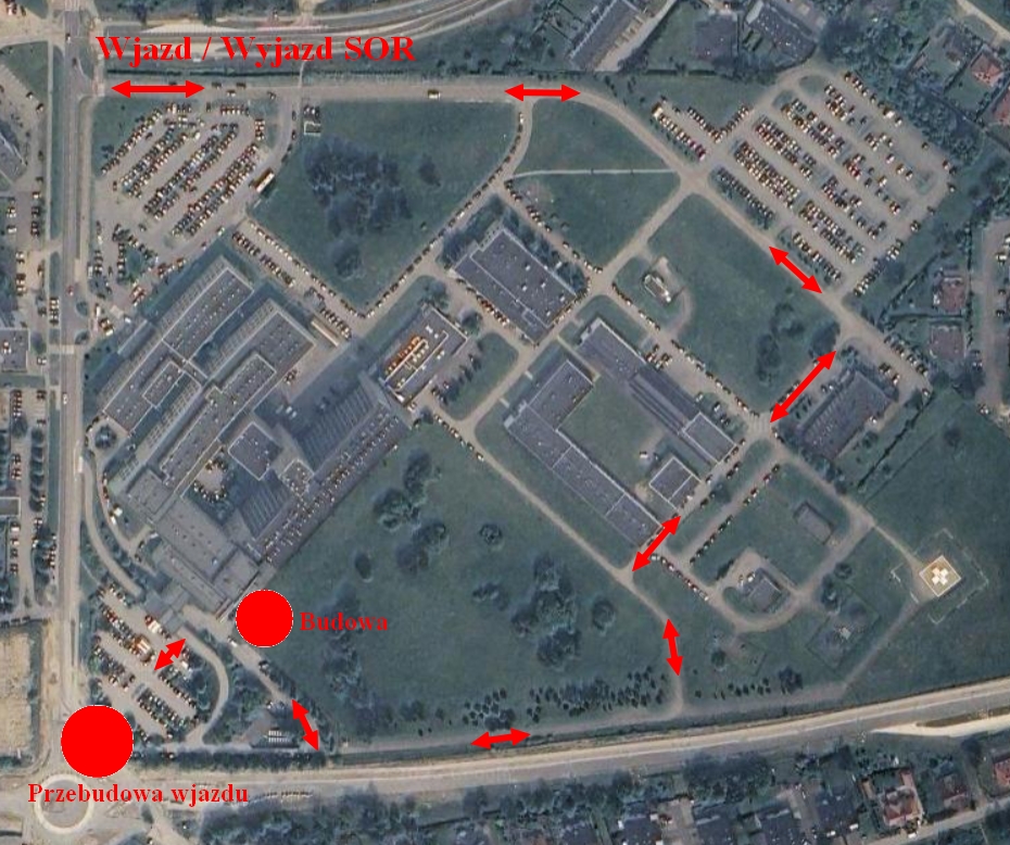 Karetki na podjazd będą wjeżdżać od ul. Hubalczyków (dotychczasowy wyjazd) i wyjeżdżać przez teren szpitala.