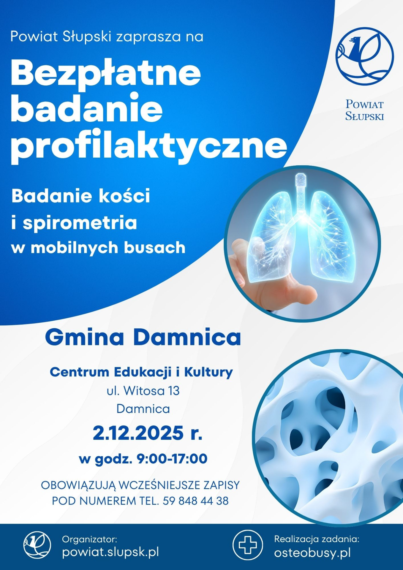 Zapraszamy do skorzystania z bezpłatnych badań profilaktycznych realizowanych wspólnie z Powiatem Słupskim dla mieszkańców Gminy Damnica. Mobilne busy będą stacjonować przed Centrum Edukacji i Kultury w Damnicy w dniu 2 grudnia.