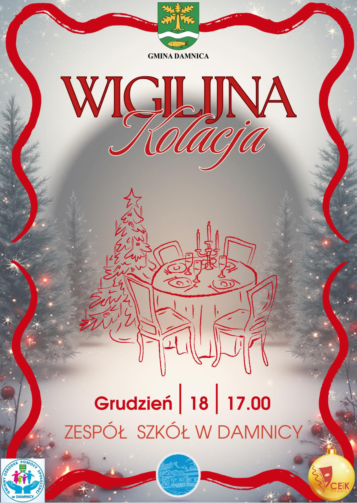 Wójt Gminy Damnica oraz Przewodniczący Rady Gminy Damnica zapraszają Seniorów na wyjątkowe spotkanie wigilijne, które odbędzie się: